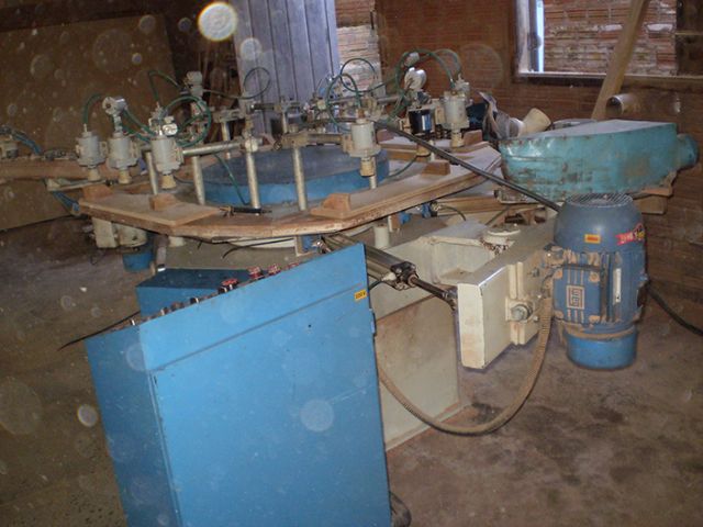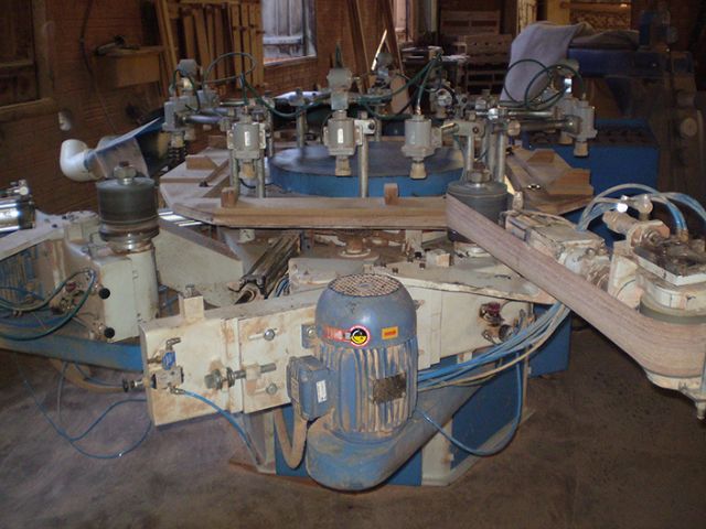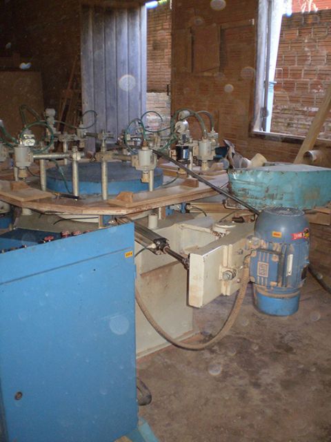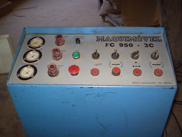 Uma fresadora lixadora marca Maquimóvel modelo FC-950-3C composta de dois grupos de fresas e dois grupos de lixas. Para pés de cadeira em madeira.
